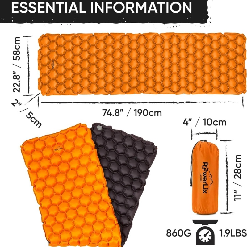 This inflatable sleeping pad is designed for comfort and convenience on outdoor adventures. Featuring ergonomic hexagon-shaped air cells that support your body’s pressure points, it delivers restful sleep whether you’re camping or backpacking. The lightweight construction and compact roll-up design make it easy to carry in your pack. With durable, waterproof nylon material and included repair kit and inflating bag, it’s built to perform across weather and terrain conditions.